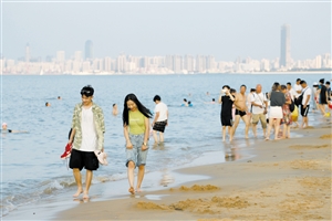 ◀市民游客到假日海滩游玩。 见习记者 王程龙 摄