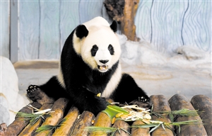 ▶大熊猫“贡贡”在享用“月饼”。 新华社记者 杨冠宇 摄