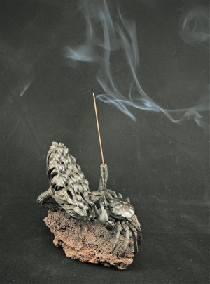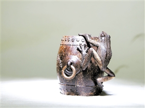▲吴名驹的作品《鼓蛙》,利用圆雕和阴雕的形式,突破了传统椰雕以浮雕为主的技法。 本报记者 吴雨倩 摄