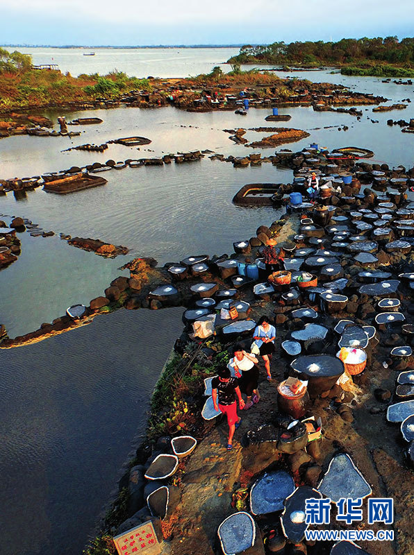 儋州峨蔓古盐田盐工劳作场景。新华网发(柯人俊 摄)