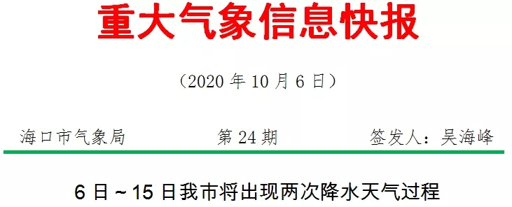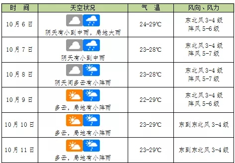 预计,受冷空气和偏东急流影响,6日~8日我市将出现持续性降雨, 9日~11日以局地阵性降雨为主,过程降雨量30-80毫米。同时,琼州海峡,6~9日白天,风力6~7级、阵风8级;9日夜间~11日,风力5~6级,雷雨时阵风7~8级。