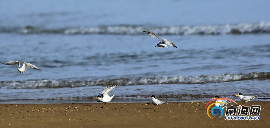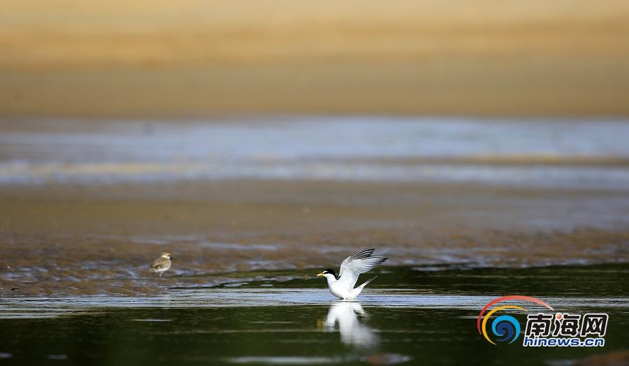 7月11日,在海口五源河国家湿地公园,成群结队的白额燕鸥在海滩上栖息觅食。记者 陈元才 摄