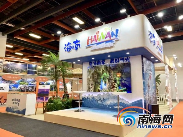 据悉,海南的参展台面积是101㎡,主题是“阳光海南,度假天堂”。在搭建风格上以蓝、白色为主色调,放置了椰树、海浪、沙滩椅、太阳伞等道具,充分展示海南的旅游特色,吸引不少参观者驻足围观。