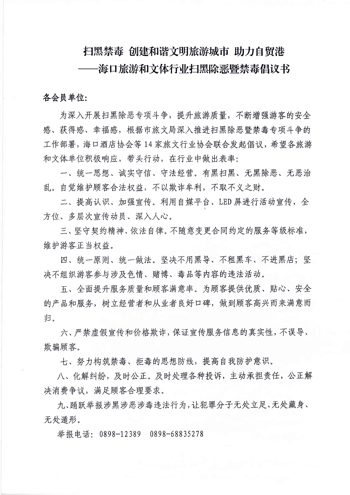 海口旅游和文体行业扫黑除恶暨禁毒倡议书