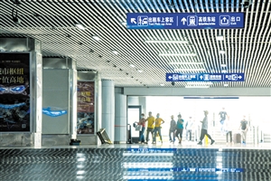7月17日,海口东站地下通道内,乘客正根据中英双语标识标牌指引有序出站。