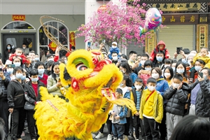 ⑥2月3日,市民游客在骑楼老街欣赏精彩舞狮表演。 本报记者 黄一冰 摄