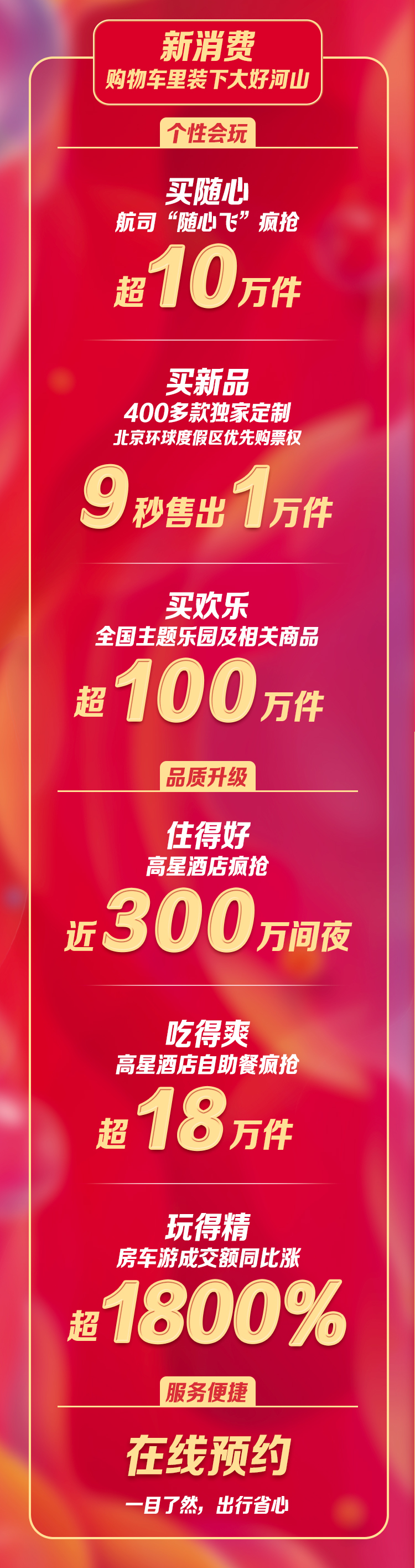 年轻新人群正在重新定义旅游品质。飞猪平台上,95后首次成为双11旅游新消费主力军,00后旅游预订量增速最快,同比涨超180%。同时,三线及以下城市出游人次占比达55%。双11期间飞猪高星酒店成交近300万间一夜,高星级酒店自助餐预订超18万份,房车游成交额比去年涨超1800%。主题乐园是Z时代和亲子客群的心头好,全国主题乐园及相关商品预订量超100万件。