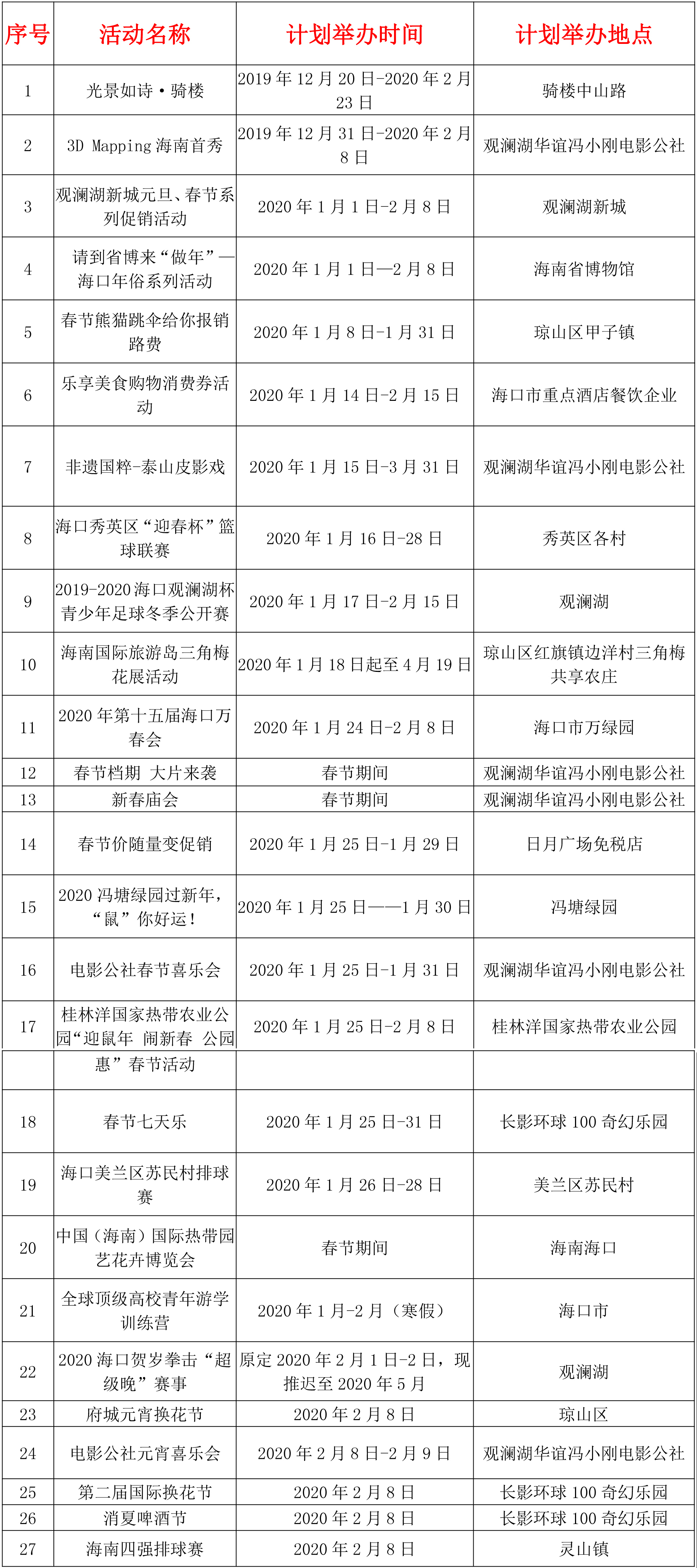 1月24日,海口市旅游和文化广电体育局发布通知,即日起海口市旅游文化系统各单位组织或举办的文艺演出、群众性文化活动、新春下基层等各类人员聚集的活动暂停举行。