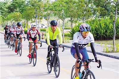 国家铁人三项队队员在白沙参加自行车训练。 特约记者吴峰 摄