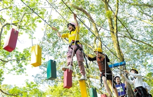 ③在火山科普亲子体验园内,家长带着孩子一起体验丛林拓展训练。 本报记者 苏弼坤