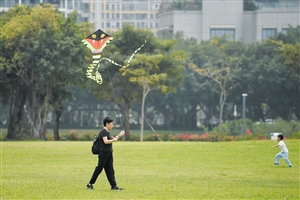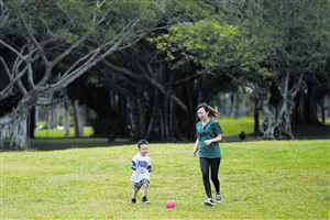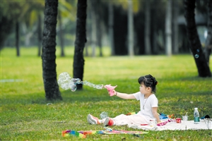海口风和日丽,人们来到户外踏青,乐享春光。图为3月19日,市民游客带着小朋友在海口万绿园游玩。 新华社发
