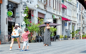 ◀市民游客在海口骑楼老街逛街游玩,陪伴家人享受愉快的假期生活。 本报记者 王程龙 摄