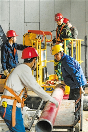 ▲▶3月22日,在海口美兰空港一站式飞机维修基地项目施工现场,工人在厂房内进行消防管道、综合支架以及电缆桥架的安装作业。目前项目进入室内装饰收尾阶段,预计6月份之前竣工移交,投入运营。