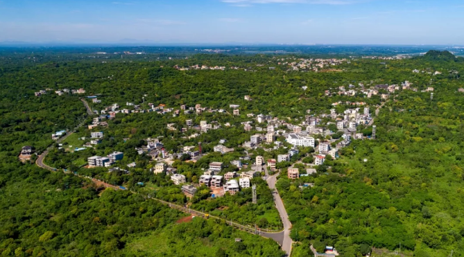 成片的绿色植被环绕着秀英区施茶村。李天平 摄