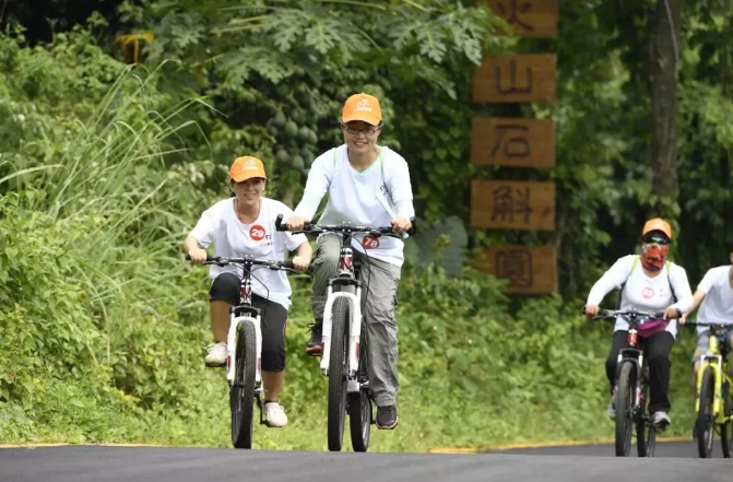 游客在施茶村石斛园里骑行。海口日报记者黄一冰 摄