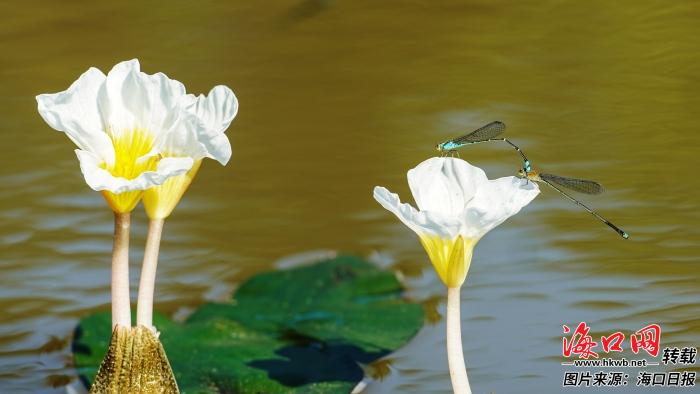 ▲在海口五源河国家湿地公园,水菜花盛开引来丹顶斑蟌。 本报记者 石中华 摄