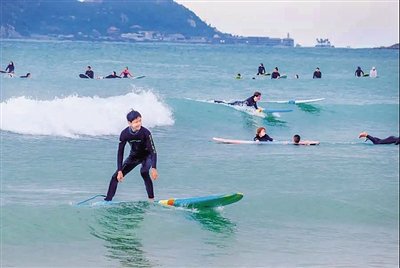 游客在日月湾冲浪。万宁旅文局供图