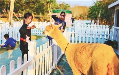 小朋友在定安县香草田园共享农庄喂羊驼。本报记者 张茂 摄
