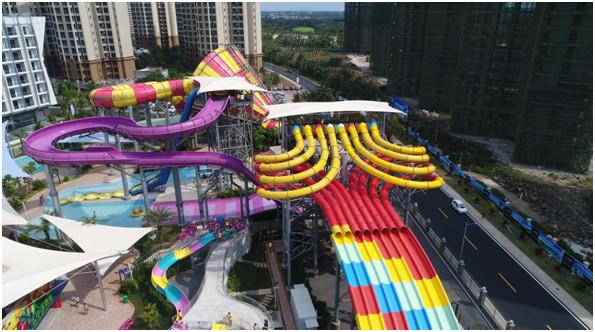海口狂欢水世界占地5万平方米,拥有国际级别的30余种代表性滑道,主要有黑暗漩涡、U型滑板、大水箭、激发360、勇闯龙脊峰、8道竞技、急速飞梯、激流勇进组合、狂欢嬉水基地等9套加拿大白水公司的进口设备组合,其中还包括专门给小小冒险家量身定制的儿童专属区域。另外,海口狂欢水世界中还有一条约330米的长漂流河及一个约3700平方米的造浪池,为广大游客在富有未来感的景区中增添极限刺激和游乐体验。