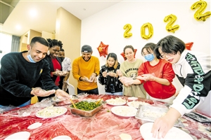 ④1月30日,海南大学国际学术交流中心30多名“就地过年”学生代表欢聚一堂,通过各类传统文化活动,欢庆新春佳节。图为参与活动的学生们在一起包饺子。本报记者 陈长宇 摄