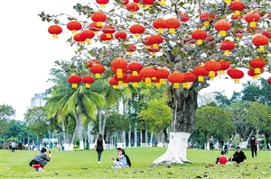 ②1月28日,绿意盎然的万绿园内挂满了红灯笼,年味十足,市民游客在园内尽情享受户外休闲好时光。本报记者 康登淋 摄