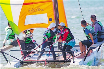 10月4日,游客在海口市国家帆船基地公共码头体验帆船运动。 本报记者 封烁 摄