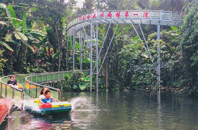 10月4日,在琼中黎族苗族自治县百花岭热带雨林文化旅游区,游客体验雨林速滑项目。 通讯员 吴丽 摄