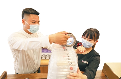免税店工作人员在给顾客打包酒类免税商品。