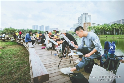 晨风清爽袭人,潋滟的湖光倒映着凉亭,长长的湖中栈道上,一群架起画板的人吸引了游人的目光。1月9日,“速写海口”的成员们在海口滨海公园迎来了第101期的写生活动。每逢周末,他们都会携笔带纸,奔赴约“绘”地点。