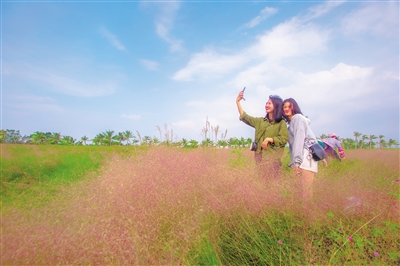 市民游客在桂林洋国家热带农业公园粉黛乱子草爱心广场拍照。 本报记者 袁琛 摄