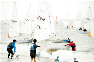 ②2月6日,海口天气晴好,广东、江苏、泉州、浙江等省市帆船运动队在西海岸训练,白帆点点蔚为壮观。