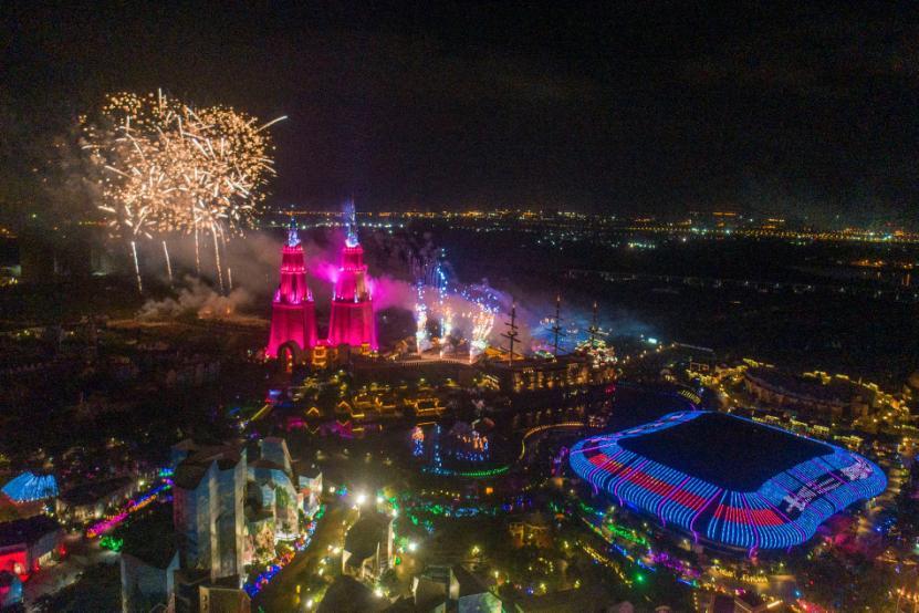 零点烟花在对新年的期盼声中冲破黑暗,长达十五分钟夜空被光影交错的礼花点亮。2020年的最后一天,不仅是新年更替,也是长影环球100奇幻乐园开园试业2周年,在欢乐喜庆的氛围之中,数万名市民游客在活动现场激情互动,为园区送上生日祝福,期待乐园新项目的开启。以烟花寄托对新年的愿望;拥抱表达对亲人的情感;热舞抒发激跨年的喜悦。