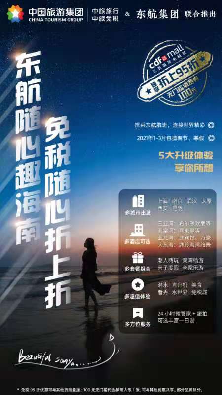 12月,海南迎来旅游旺季,中国旅游集团旗下中旅旅行、中旅免税联合东方航空推出了以“多城市出发、多酒店可选、多套餐组合、多方位服务”为特色的“东航随心趣海南”全新自由行系列产品。