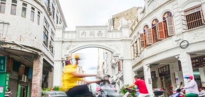 中山路是骑楼打造的精品风情街区,开阔街道两旁骑楼多为二、三层,一柱一廊,无不精雕细琢,一家家商号或清晰或斑驳、仿欧式彩色玻璃窗、小圆顶窗外撑蓬流露浓郁的欧亚风情。