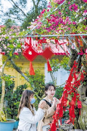 2月25日,在三角梅共享农庄,市民游客将心愿卡系在三角梅花王树上祈福。 本报记者 康登淋 摄