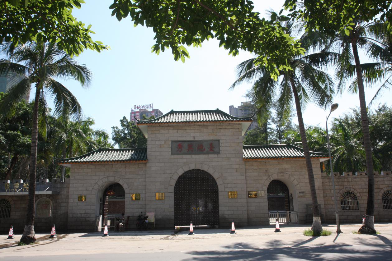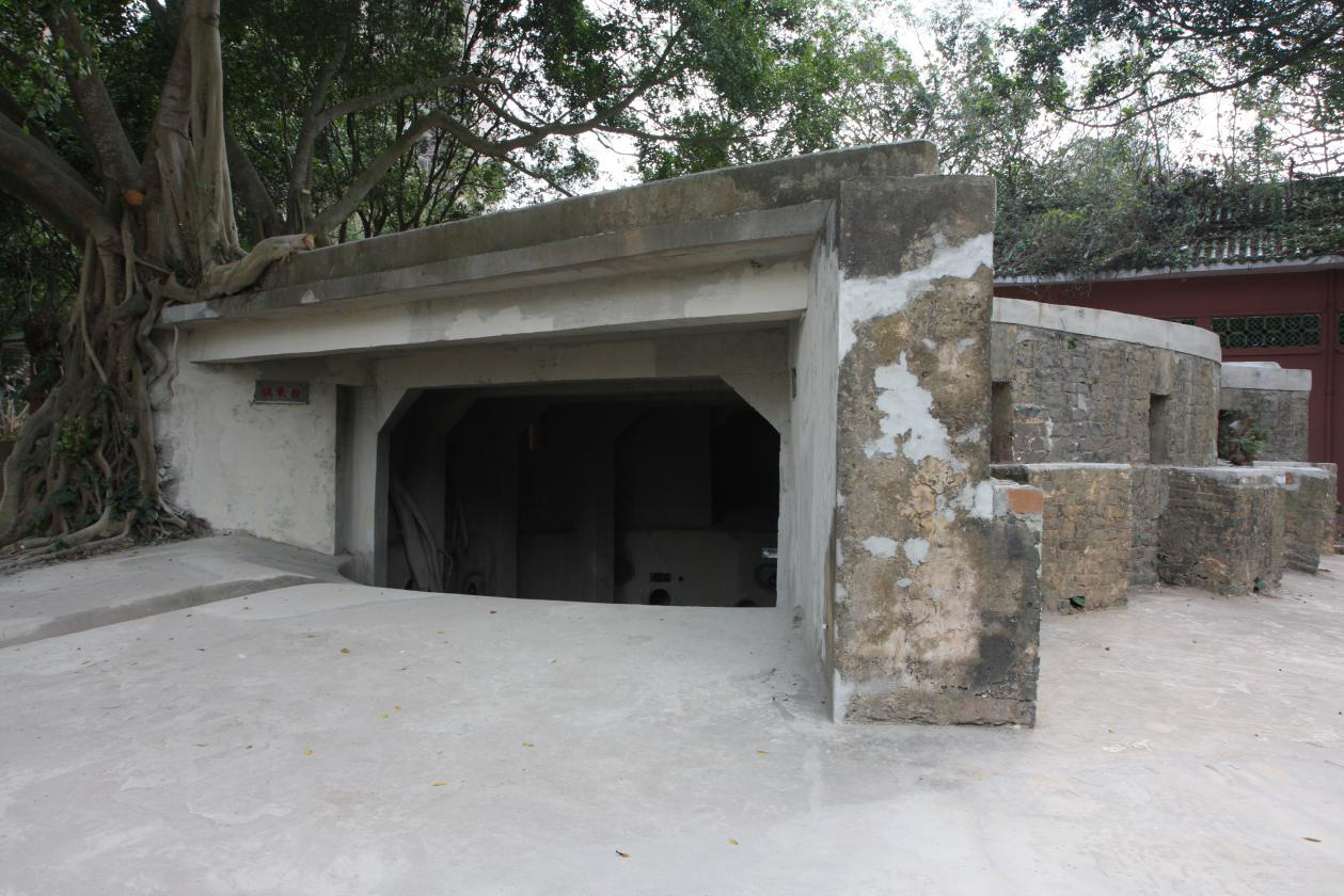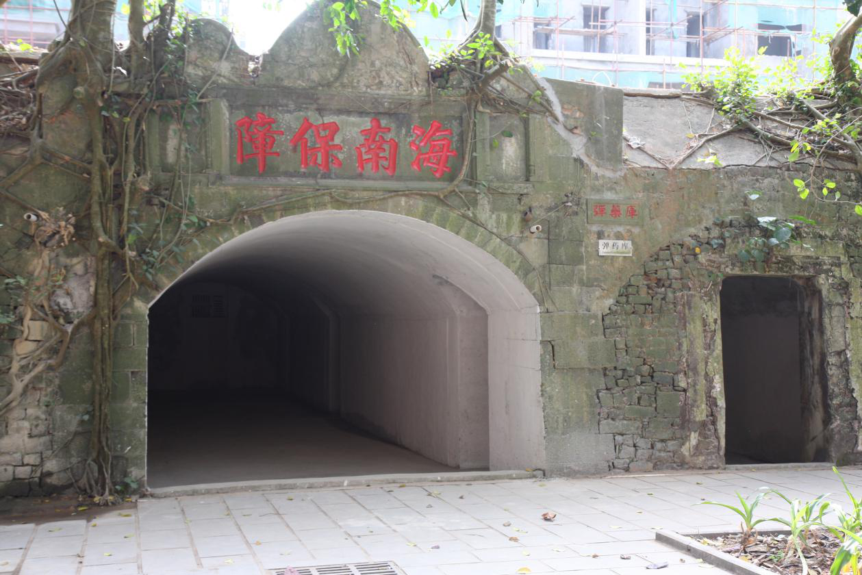 此地应该是秀英炮台的出入口,巷道上方置“海南保障”石匾额,巷道长18米,宽3.40米,各间房内又设小门相通,外侧上方置“秀英炮台”石匾额。巷道东西各设3间房为弹药库,外设小门,为平时存放秀英炮台专用弹药及军械之处。
