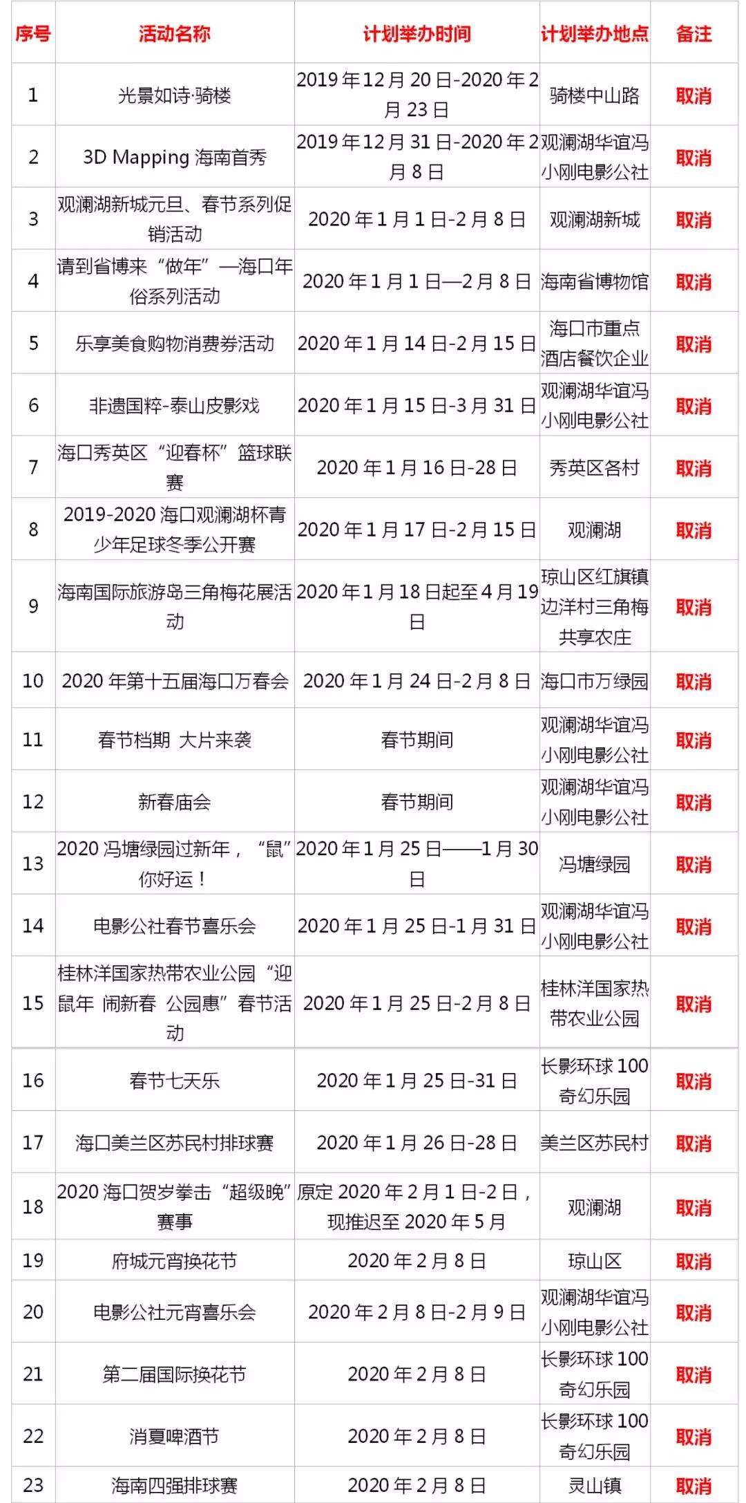 根据海口市新型冠状病毒感染肺炎疫情防控指挥部总体部署,海口市旅游和文化广电体育局联合四个区旅文局、各涉旅协会、企业积极行动,落实省市防控工作,避免人员聚集引发交叉感染,切实保障广大市民和游客的身体健康。自1月24日起,海口各景区积极响应主动暂停开放,并相继发布闭园公告。全市已全部取消所有大型公共活动,乡镇政府积极劝导各乡村民众取消自发性聚集活动。