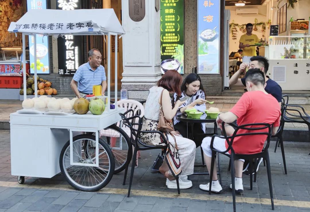 漫步中山路步行街,穿着时髦的手艺人在街道两侧经营着自己的小铺子,不慌不忙地制作着手中的工艺品;即使在工作日,也能见到人们三两相伴赏花观鸟的独特景象;甚至有不少海口百姓,会在清晨专程前往水巷口,只为寻一碗记忆里的骑楼老味道。