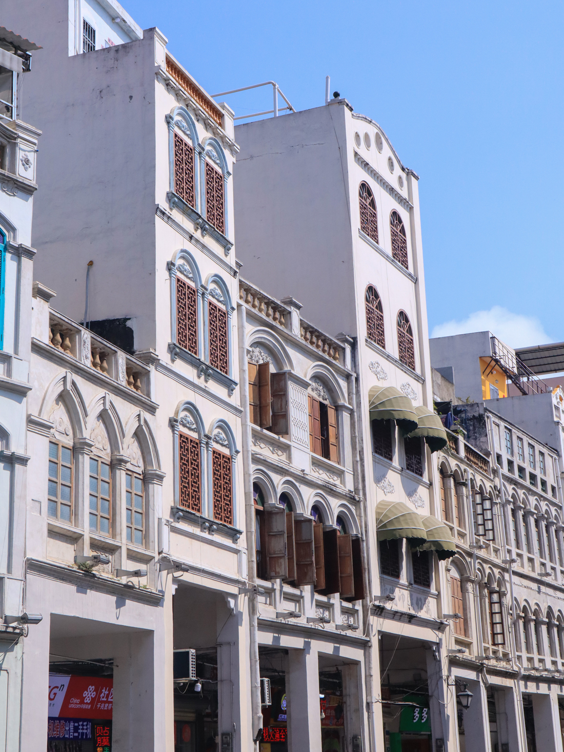 无缝相连的骑楼墙体,透露着南国儿女们和睦融洽的邻里关系与团结协作的奋斗精神。细节之处透露着房主的不同审美,大肆彰显海南本土风俗民情。骑楼建筑第一大特色廊柱,将欧洲特色与东南亚气息融于一身;长方形、三角状、马蹄形、弓形……造型多样的窗楣,处处透露出工匠的智慧;骑楼立面顶部,单孔或多孔洞的女儿墙借建筑智慧减少风力负荷,以“横三段对称式”构成一条条波浪般流动的绝美天际线;狭长的木质百叶窗纷繁多姿,时光穿过一道道窗间缝隙,再现往昔旧颜。