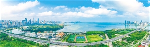 日前,俯瞰海口湾沿岸风光,湛蓝天空上白云朵朵,蜿蜒的海岸绿意盎然,车辆在大桥上穿梭,一派勃勃生机的图景。