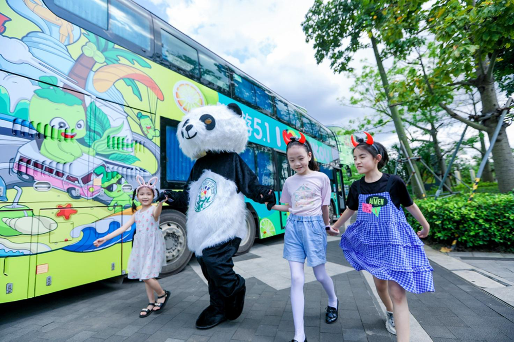 “福袋巴士”只要上路,便是海口最亮眼的存在。市民游客只要看到车厢涂装上有海口知名IP——“啵啵椰”形象和热带水果、椰树、沙滩等海口特色元素;海南野生动植物园内的明星动物——大熊猫、长臂猿、老虎的主题,便知道是“福袋巴士”在向你驶来。