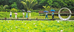 今年“五一”假期期间,海口细雨绵绵,天气凉爽,图为市民游客撑伞在芳园国际艺术村荷塘栈道上“赏荷”。 本报记者 陈长宇 摄