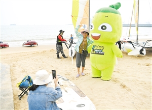 ▲5月4日,海口西海岸,游客与海南旅文吉祥物波波椰合影。 本报记者 张俊其 摄