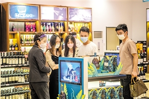 ▲5月2日下午,海口日月广场免税店内,不少消费者在此选购酒类产品。 本报记者 陈长宇 摄