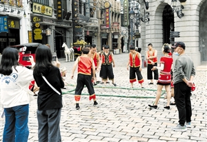 ②海口观澜湖电影公社的竹竿舞表演,吸引市民游客驻足观看。 本报记者 张俊其 摄