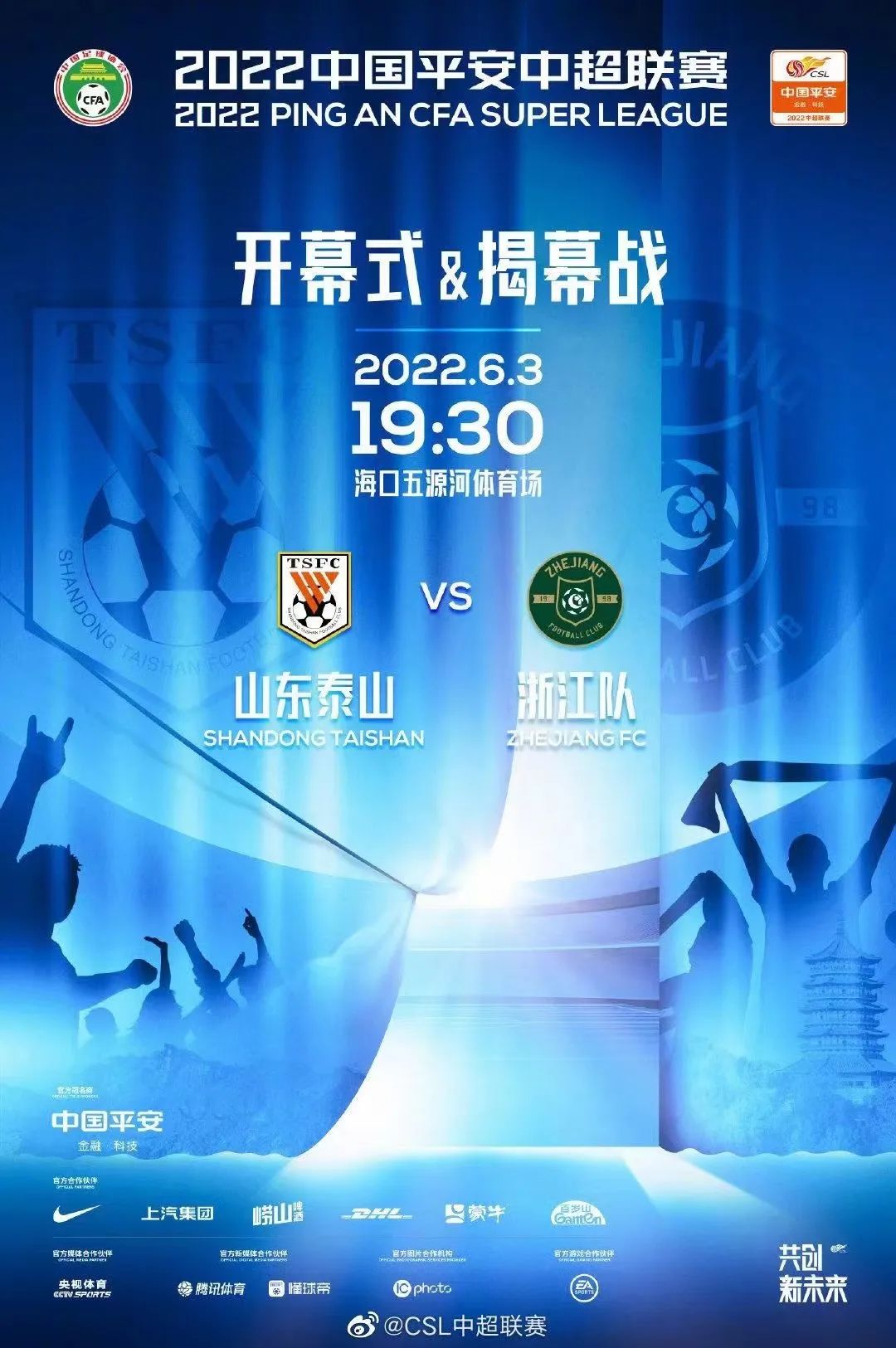 6月3日晚 2022中超联赛将于海口举行开幕式 开幕式结束后将迎来万众瞩目的揭幕战 卫冕冠军山东泰山对阵升班马浙江队