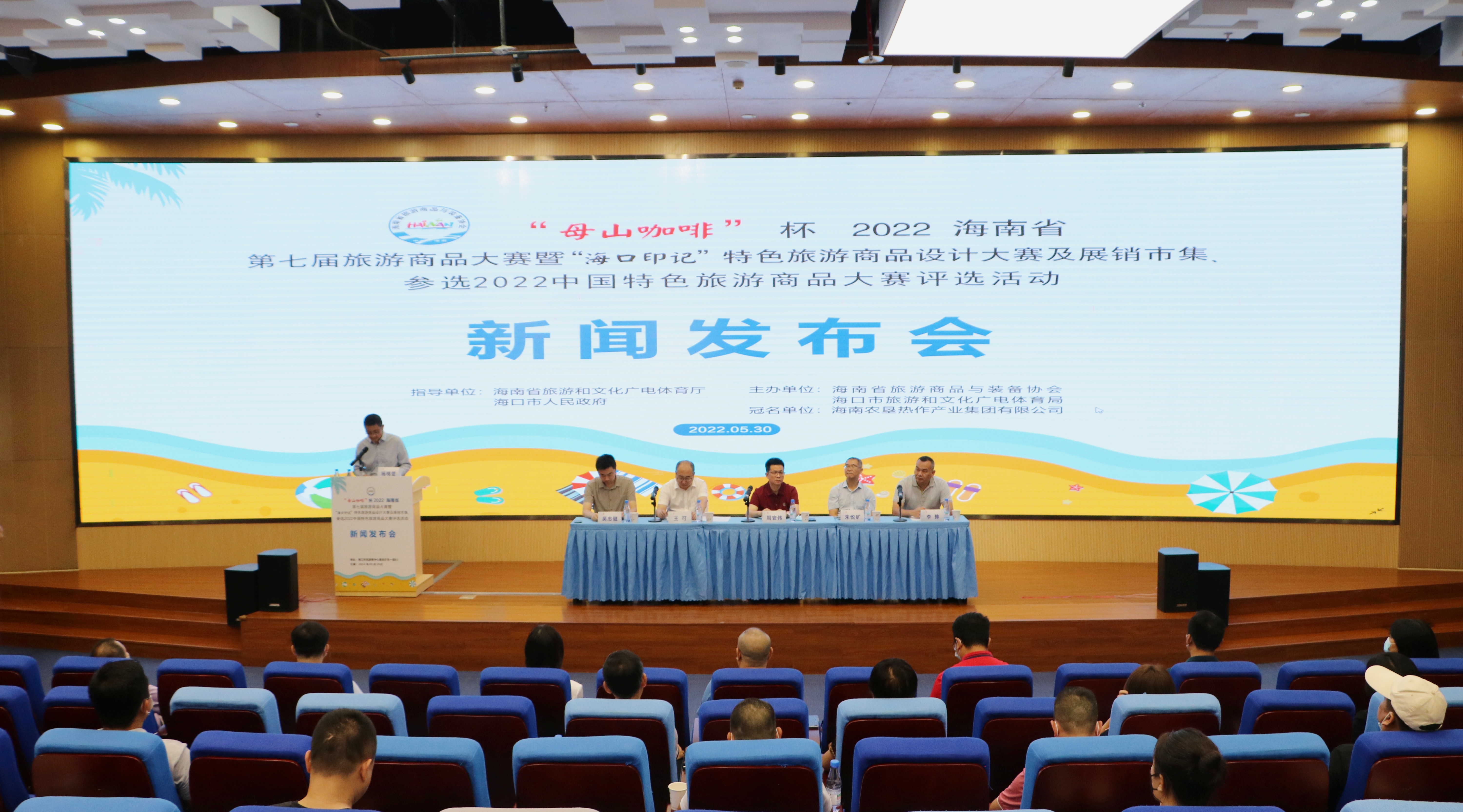 5月30日上午,由海南省旅游和文化广电体育厅、海口市人民政府指导,海南省旅游商品与装备协会、海口市旅游和文化广电体育局联合主办的“母山咖啡杯”2022海南省第七届旅游商品大赛暨“海口印记”特色旅游商品设计大赛及展销市集、参选2022中国特色旅游商品大赛评选活动新闻发布会在海口市民游客中心隆重召开。