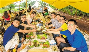 ◀6月4日,在美兰区演丰镇芳园村的露营区,前来露营的市民游客正在享受美好的假日时光。 本报记者 陈长宇 摄
