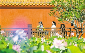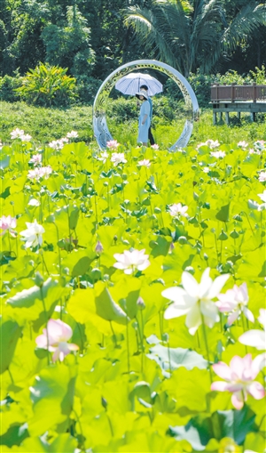 ▲6月4日,海口市美兰区芳园艺术村荷花盛开,市民游客在栈道上赏荷。 本报记者 康登淋 摄