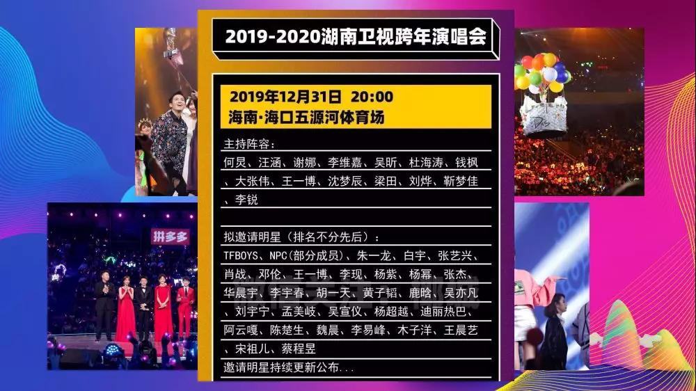 9大欢乐盛典。包括湖南卫视海口跨年演唱会,歌手陈慧娴、华晨宇、张韶涵个人专场演唱会。